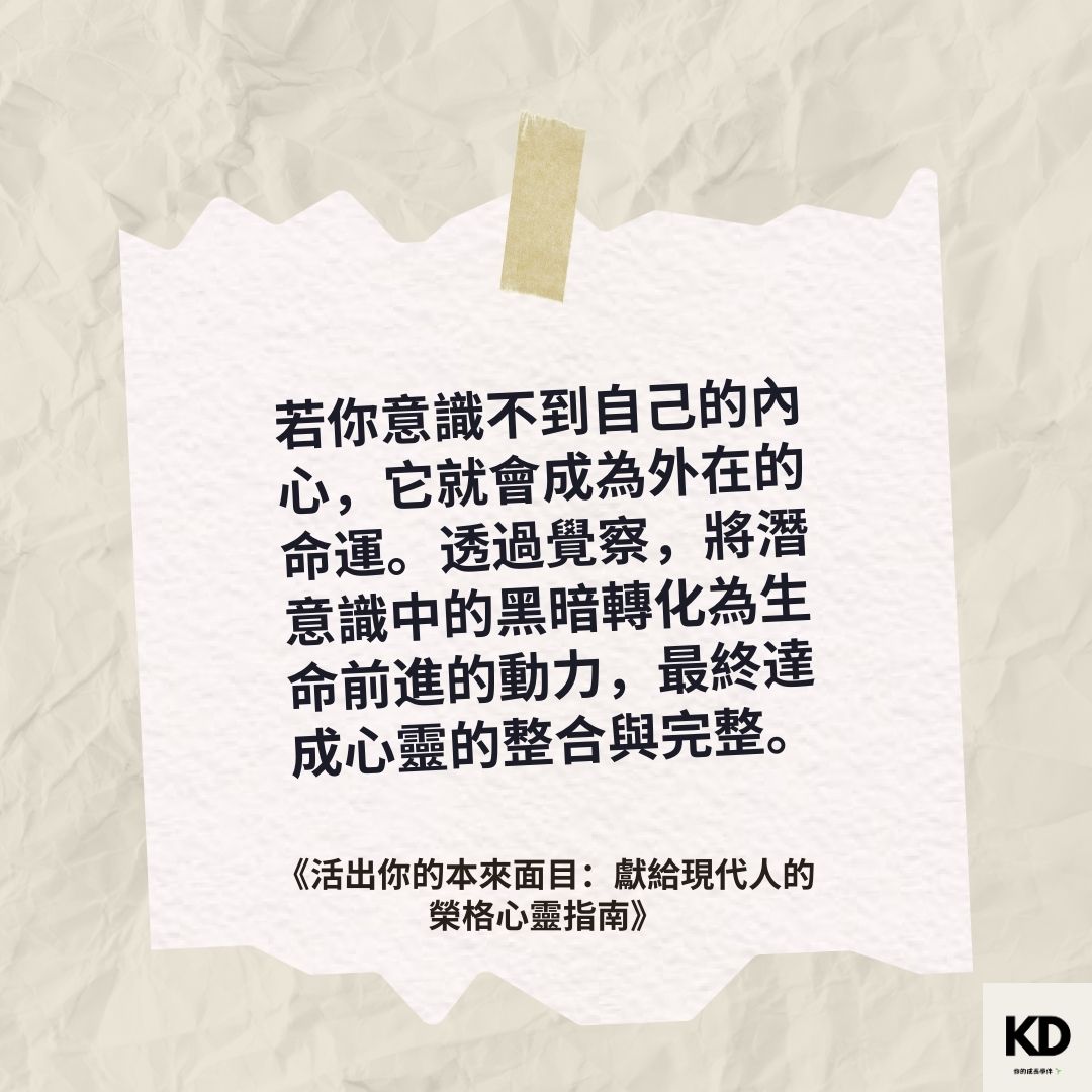「若你意識不到自己的內心,它就會成為外在的命運。透過覺察,將潛意識中的黑暗轉化為生命前進的動力,最終達成心靈的整合與完整。」