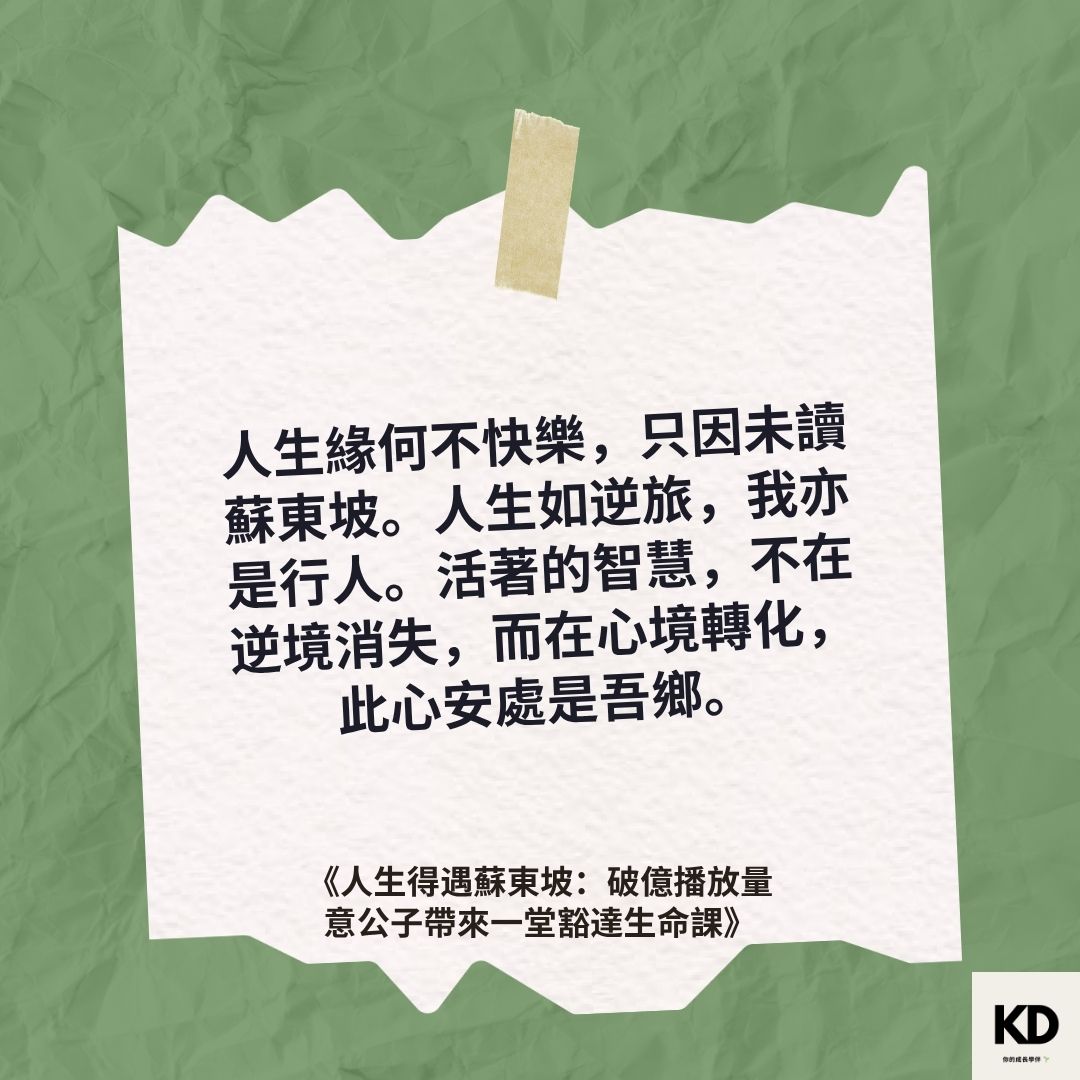 「人生緣何不快樂,只因未讀蘇東坡。人生如逆旅,我亦是行人。活著的智慧,不在逆境消失,而在心境轉化,此心安處是吾鄉。」