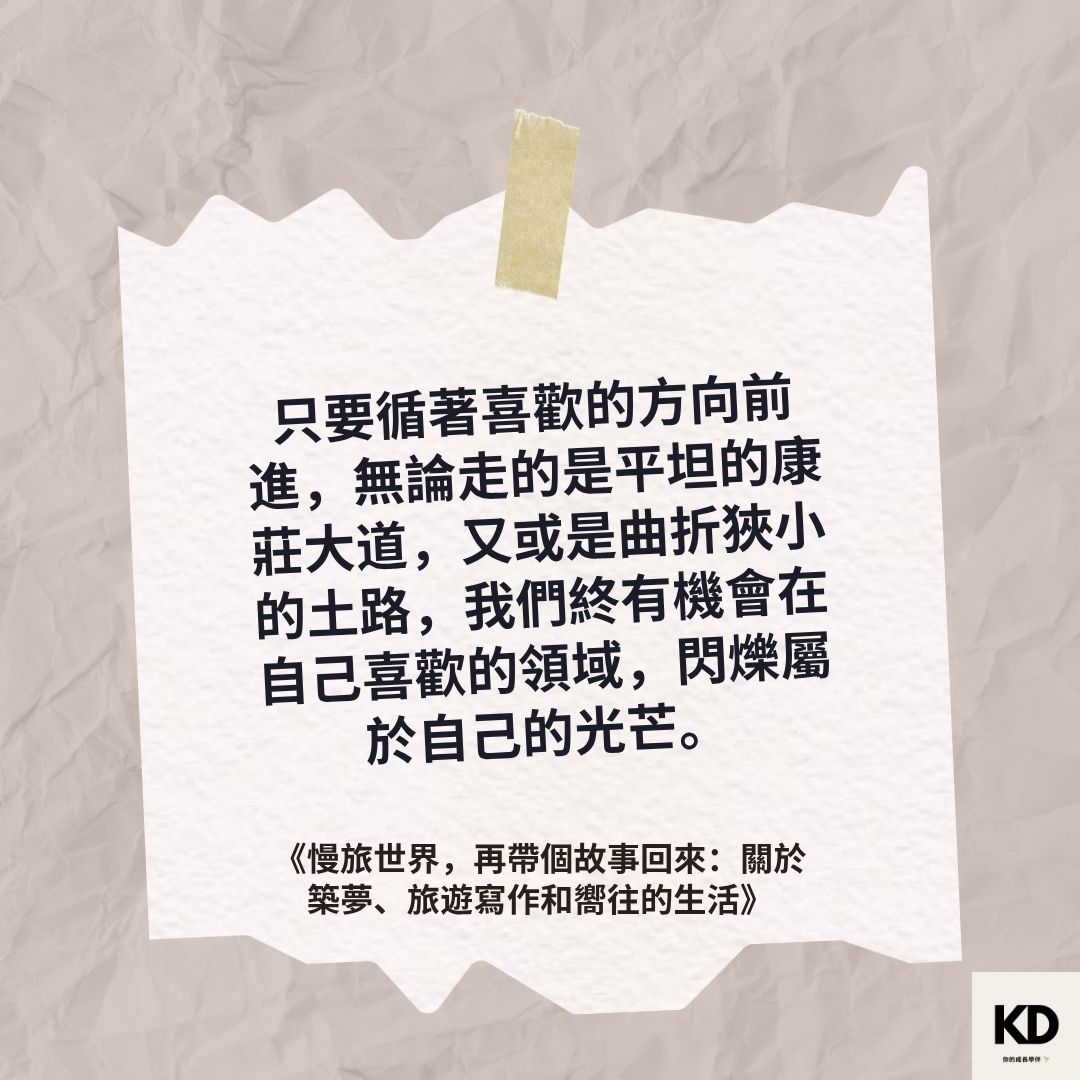 「只要循著喜歡的方向前進,無論走的是平坦的康莊大道,又或是曲折狹小的土路,我們終有機會在自己喜歡的領域,閃爍屬於自己的光芒。」
