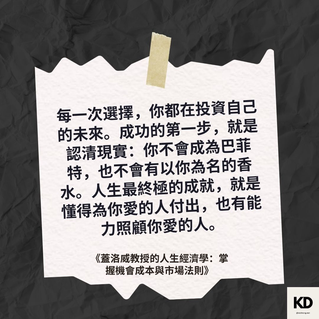 「每一次選擇,你都在投資自己的未來。成功的第一步,就是認清現實:你不會成為巴菲特,也不會有以你為名的香水。人生最終極的成就,就是懂得為你愛的人付出,也有能力照顧你愛的人。」