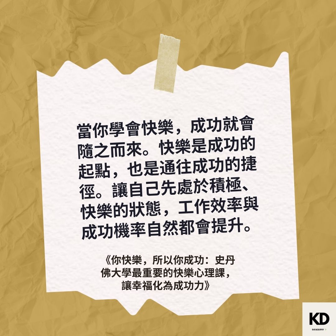 「當你學會快樂,成功就會隨之而來。快樂是成功的起點,也是通往成功的捷徑。讓自己先處於積極、快樂的狀態,工作效率與成功機率自然都會提升。」