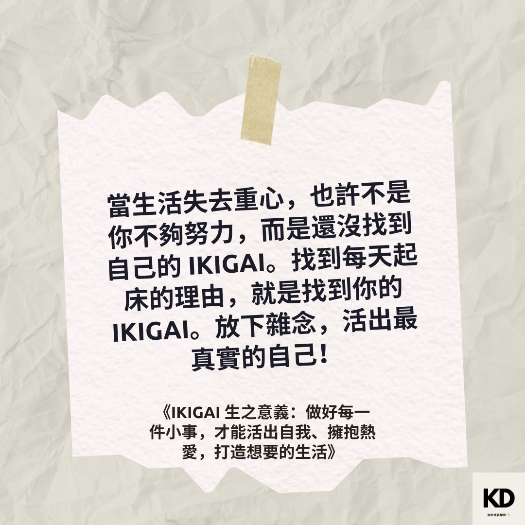 「當生活失去重心,也許不是你不夠努力,而是還沒找到自己的 IKIGAI。找到每天起床的理由,就是找到你的 IKIGAI。放下雜念,活出最真實的自己!」