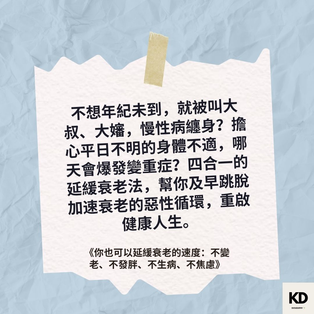 「不想年紀未到,就被叫大叔、大嬸,慢性病纏身?擔心平日不明的身體不適,哪天會爆發變重症?四合一的延緩衰老法,幫你及早跳脫加速衰老的惡性循環,重啟健康人生。」
