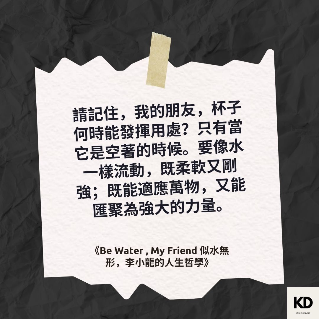 《Be Water , My Friend 似水無形,李小龍的人生哲學:水很柔弱,卻能穿透最堅硬的物質,你感覺它平靜停滯,卻正流進任何可能的地方。》