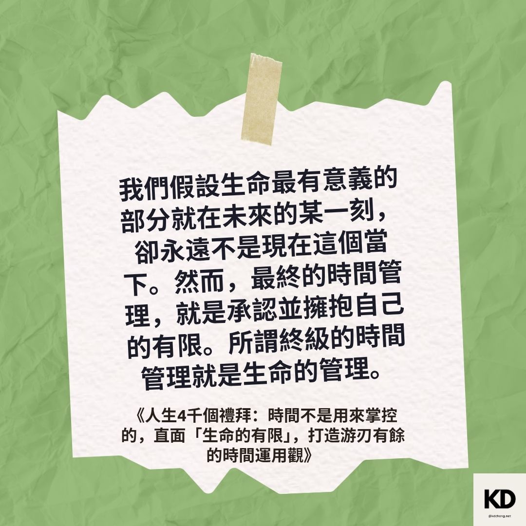 「我們假設生命最有意義的部分就在未來的某一刻,卻永遠不是現在這個當下。然而,最終的時間管理,就是承認並擁抱自己的有限。所謂終級的時間管理就是生命的管理。」