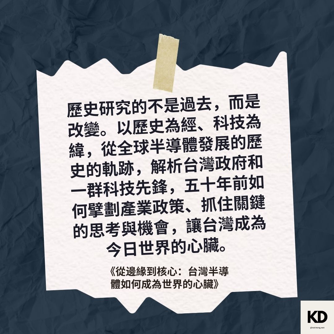「歷史研究的不是過去,而是改變。以歷史為經、科技為緯,從全球半導體發展的歷史的軌跡,解析台灣政府和一群科技先鋒,五十年前如何擘劃產業政策、抓住關鍵的思考與機會,讓台灣成為今日世界的心臟。」
