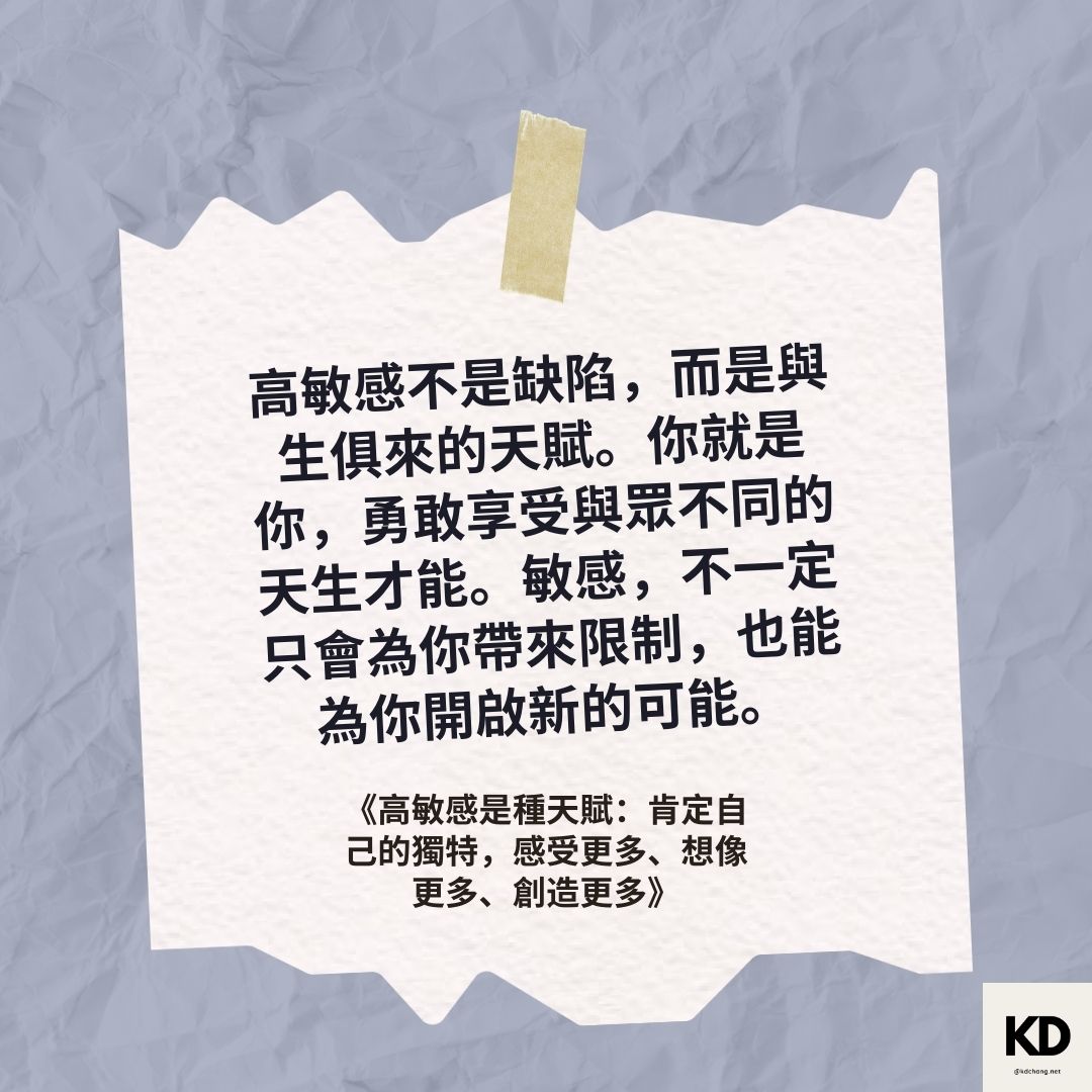 「高敏感不是缺陷,而是與生俱來的天賦。你就是你,勇敢享受與眾不同的天生才能。敏感,不一定只會為你帶來限制,也能為你開啟新的可能。」