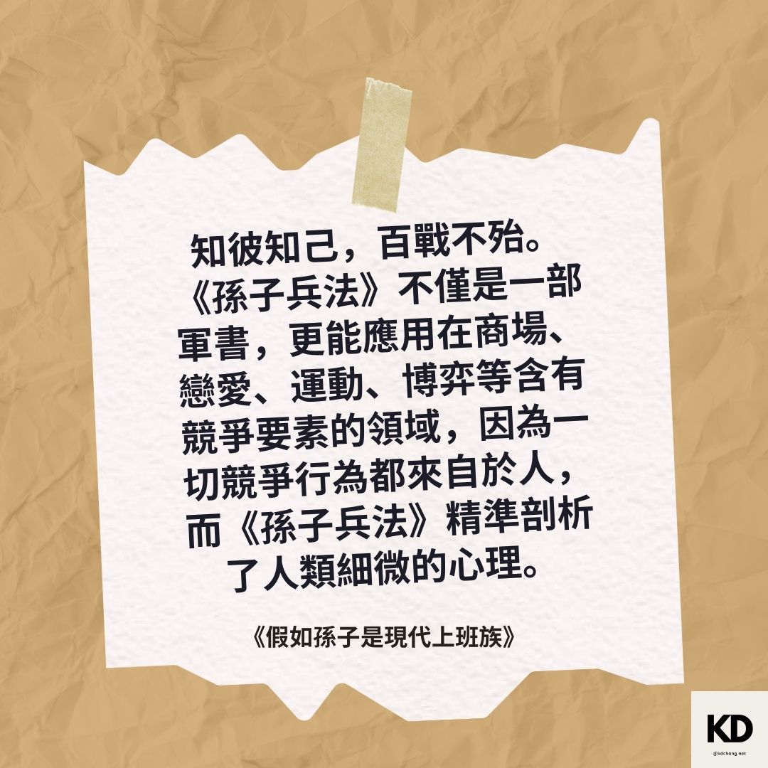 「知彼知己,百戰不殆。《孫子兵法》不僅是一部軍書,更能應用在商場、戀愛、運動、博弈等含有競爭要素的領域,因為一切競爭行為都來自於人,而《孫子兵法》精準剖析了人類細微的心理。」