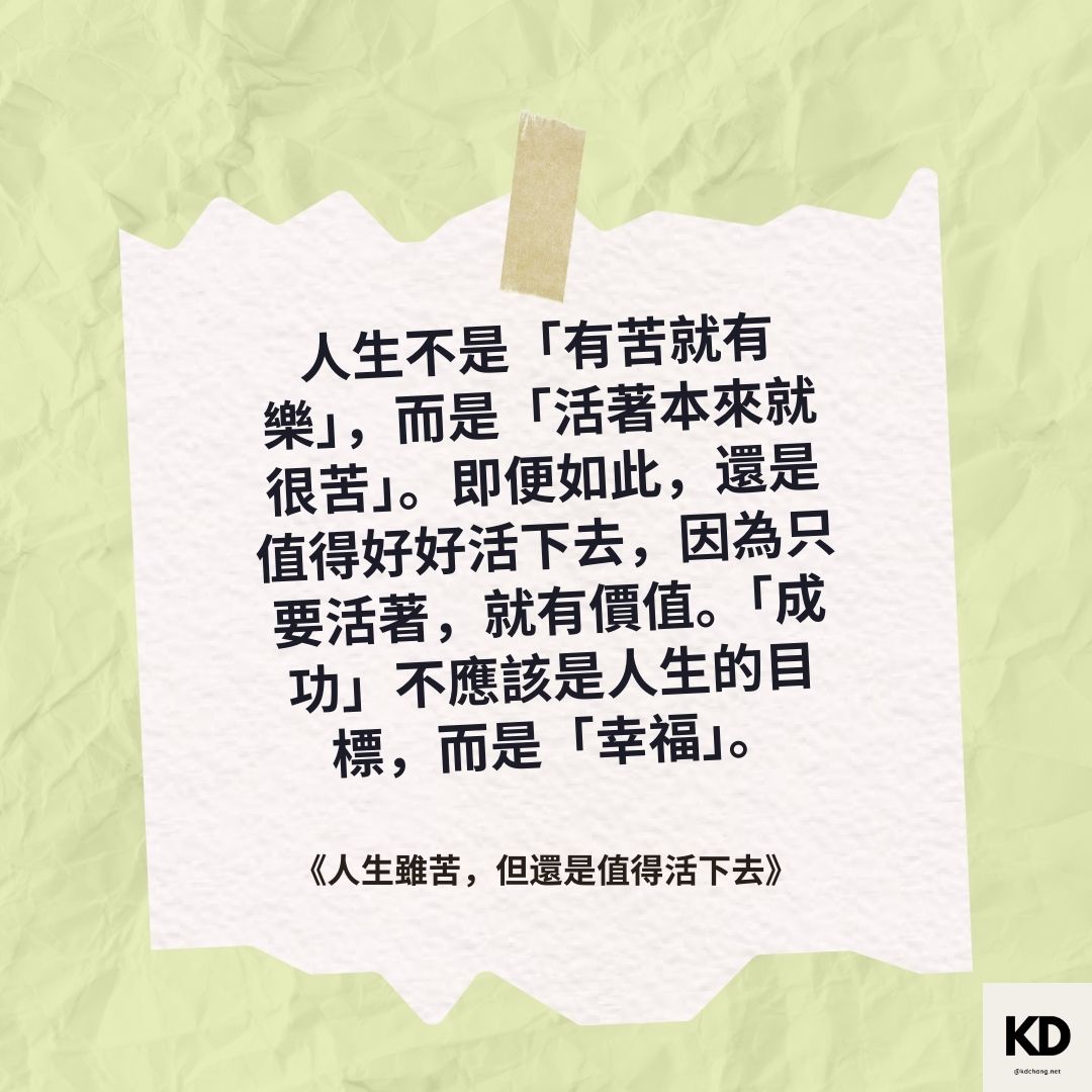 「人生不是「有苦就有樂」,而是「活著本來就很苦」。即便如此,還是值得好好活下去,因為只要活著,就有價值。「成功」不應該是人生的目標,而是「幸福」。」