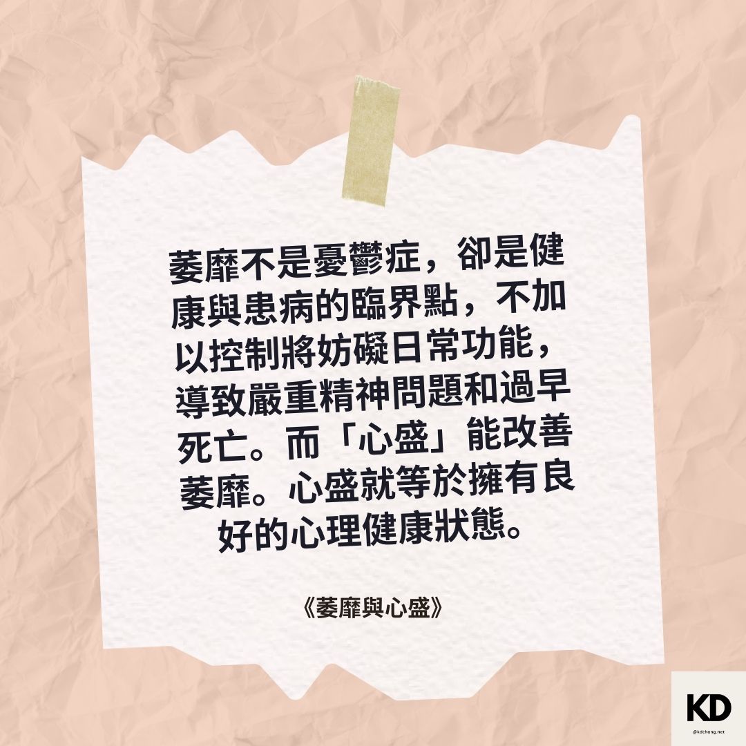 「萎靡不是憂鬱症,卻是健康與患病的臨界點,不加以控制將妨礙日常功能,導致嚴重精神問題和過早死亡。而「心盛」能改善萎靡。心盛就等於擁有良好的心理健康狀態。」