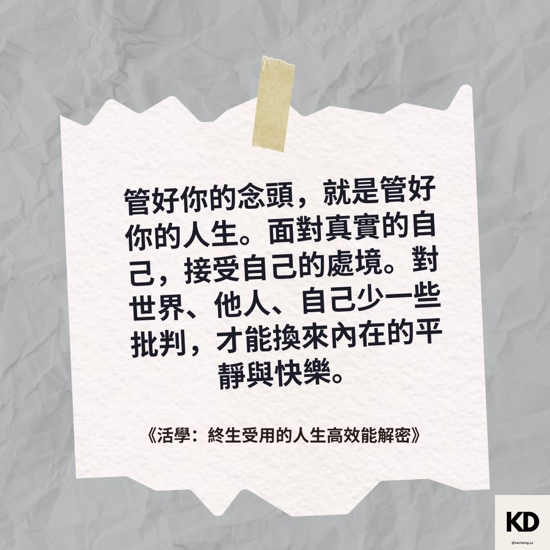 「管好你的念頭,就是管好你的人生。面對真實的自己,接受自己的處境。對世界、他人、自己少一些批判,才能換來內在的平靜與快樂。」