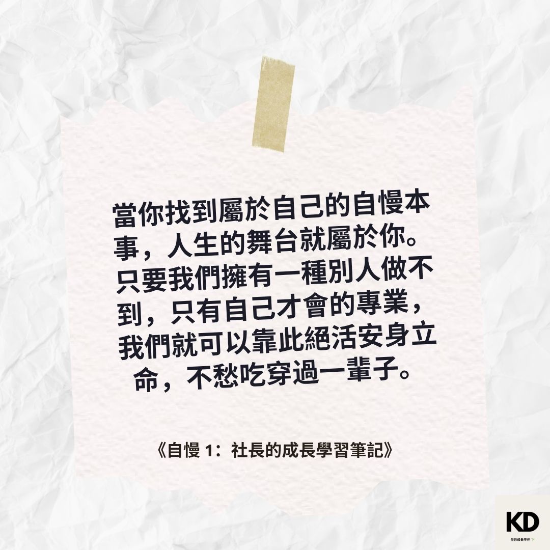 「當你找到屬於自己的自慢本事,人生的舞台就屬於你。只要我們擁有一種別人做不到,只有自己才會的專業,我們就可以靠此絕活安身立命,不愁吃穿過一輩子,又何必擔心人生的起伏和風雨呢?」