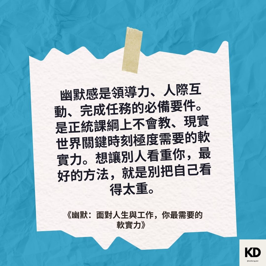 「幽默感是領導力、人際互動、完成任務的必備要件。是正統課綱上不會教、現實世界關鍵時刻極度需要的軟實力。想讓別人看重你,最好的方法,就是別把自己看得太重。」
