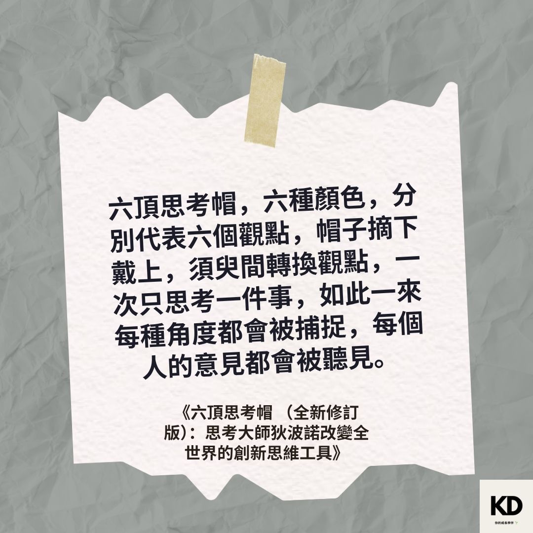 「六頂思考帽,六種顏色,分別代表六個觀點,白(客觀)、紅(情感)、黑(批判)、黃(積極)、綠(創意)、藍(控制),帽子摘下戴上,須臾間轉換觀點,一次只思考一件事,如此一來每種角度都會被捕捉,每個人的意見都會被聽見。」