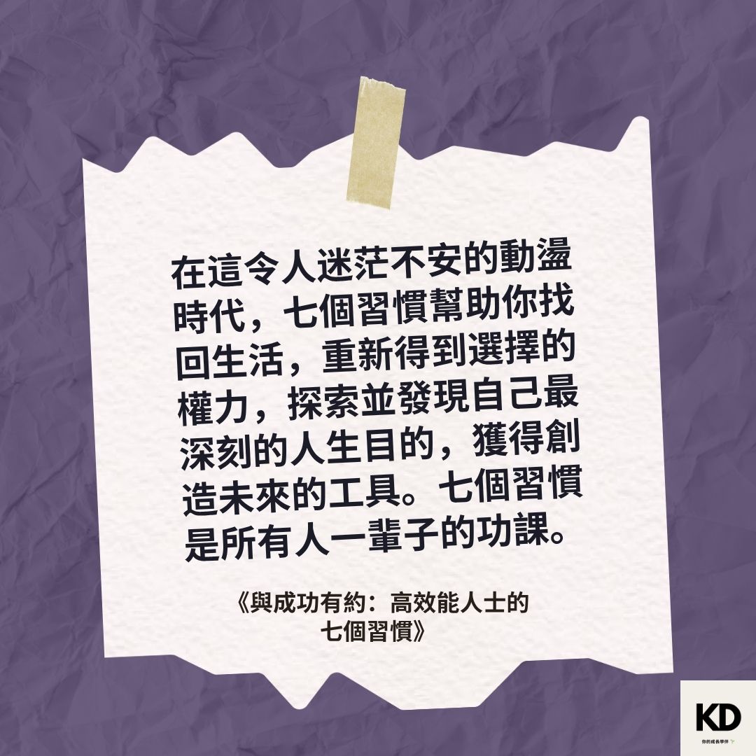 「在這令人迷茫不安的動盪時代,七個習慣幫助你找回生活,重新得到選擇的權力,探索並發現自己最深刻的人生目的,獲得創造未來的工具。七個習慣是所有人一輩子的功課。」