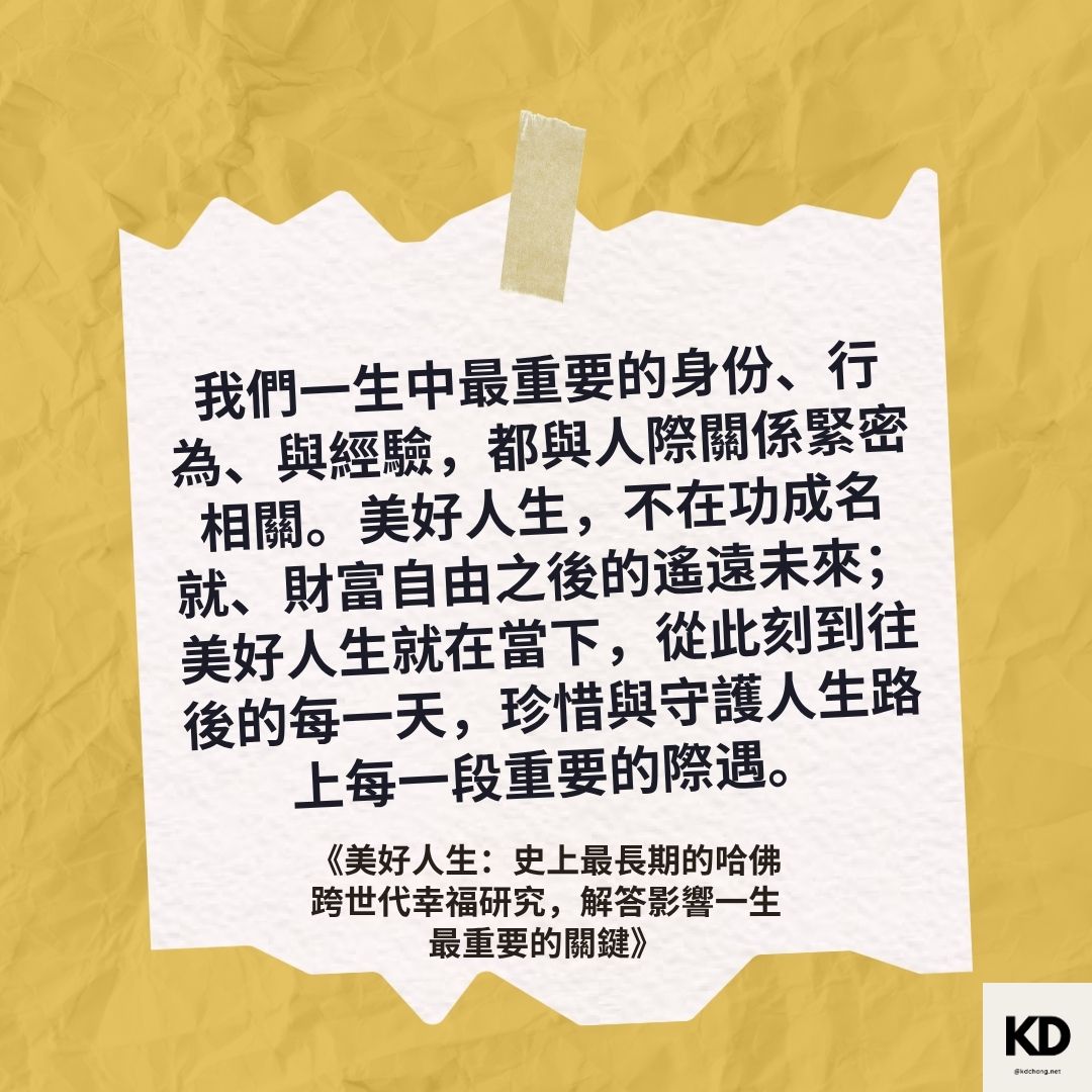 「好人生,不在功成名就、財富自由之後的遙遠未來;美好人生就在當下,從此刻到往後的每一天,珍惜與守護人生路上每一段重要的際遇。我們一生中最重要的身份、行為、與經驗,都與人際關係緊密相關。」