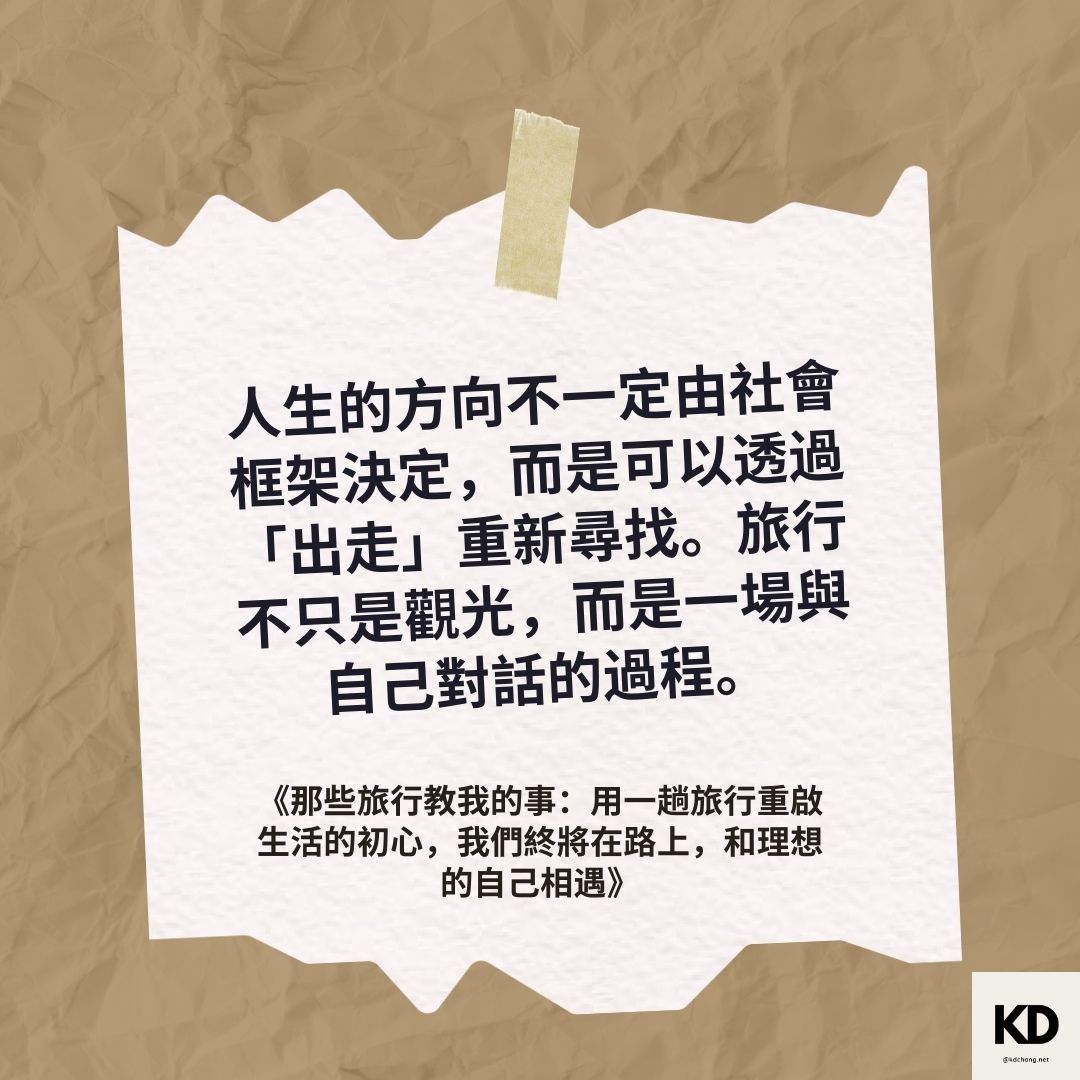 「人生的方向不一定由社會框架決定,而是可以透過「出走」重新尋找。旅行不只是觀光,而是一場與自己對話的過程。」