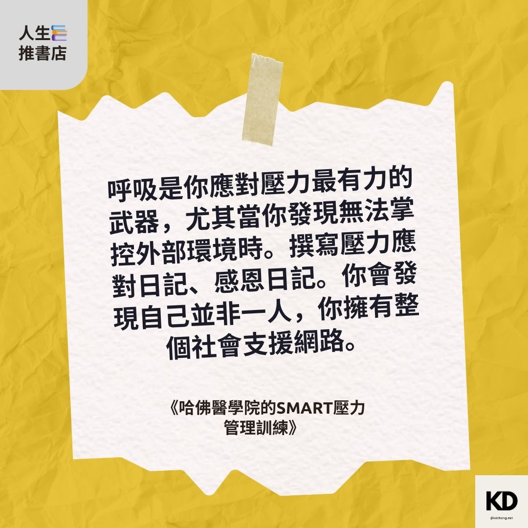 「呼吸是你應對壓力最有力的武器,尤其當你發現無法掌控外部環境時。撰寫壓力應對日記、感恩日記。你會發現自己並非一人,你擁有整個社會支援網路。」