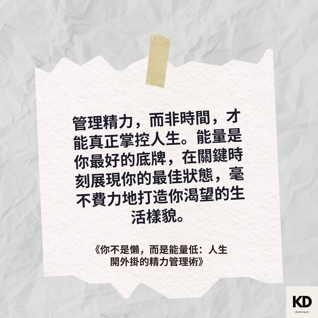 「管理精力,而非時間,才能真正掌控人生。能量是你最好的底牌,在關鍵時刻展現你的最佳狀態,毫不費力地打造你渴望的生活樣貌。」